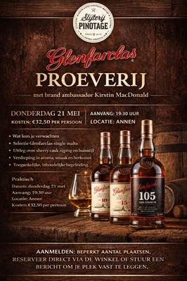 Donderdag 21 mei organiseren wij een exclusieve proeverij van het Schotse familiehuis Glenfarclas. Deze avond wordt begeleid door brand ambassador Kirstin MacDonald, die je meeneemt in stijl, rijping en karakter van deze klassieke Speyside-distilleerderij.
